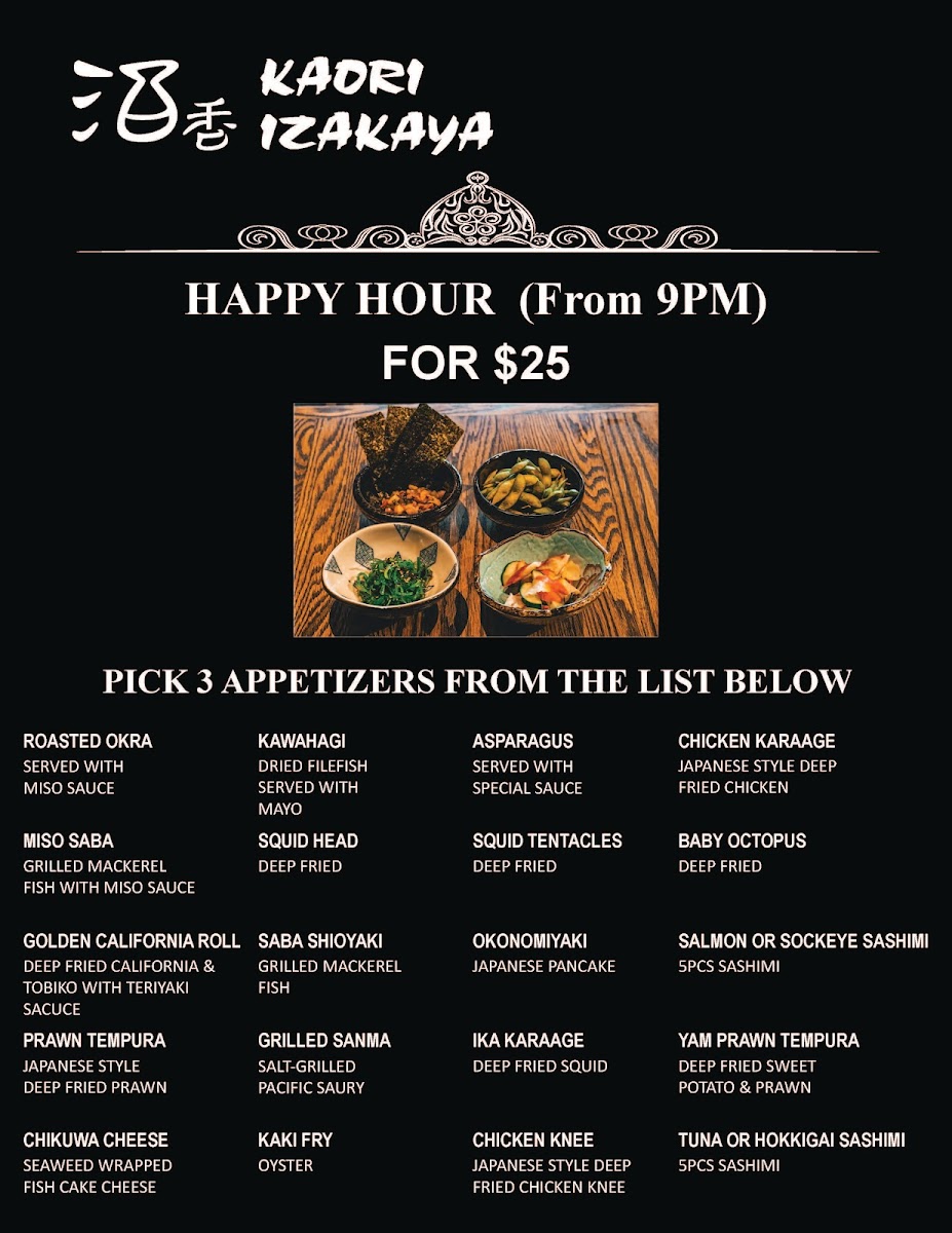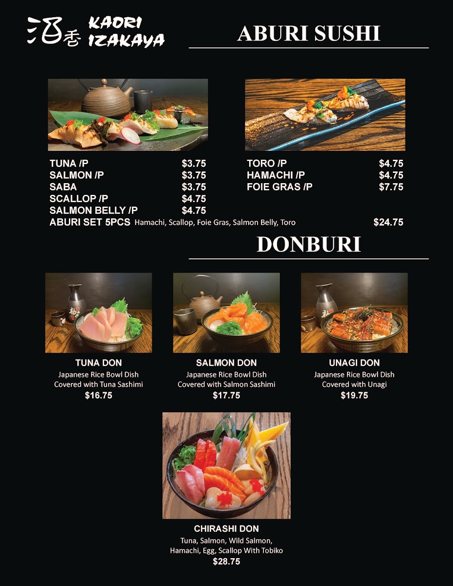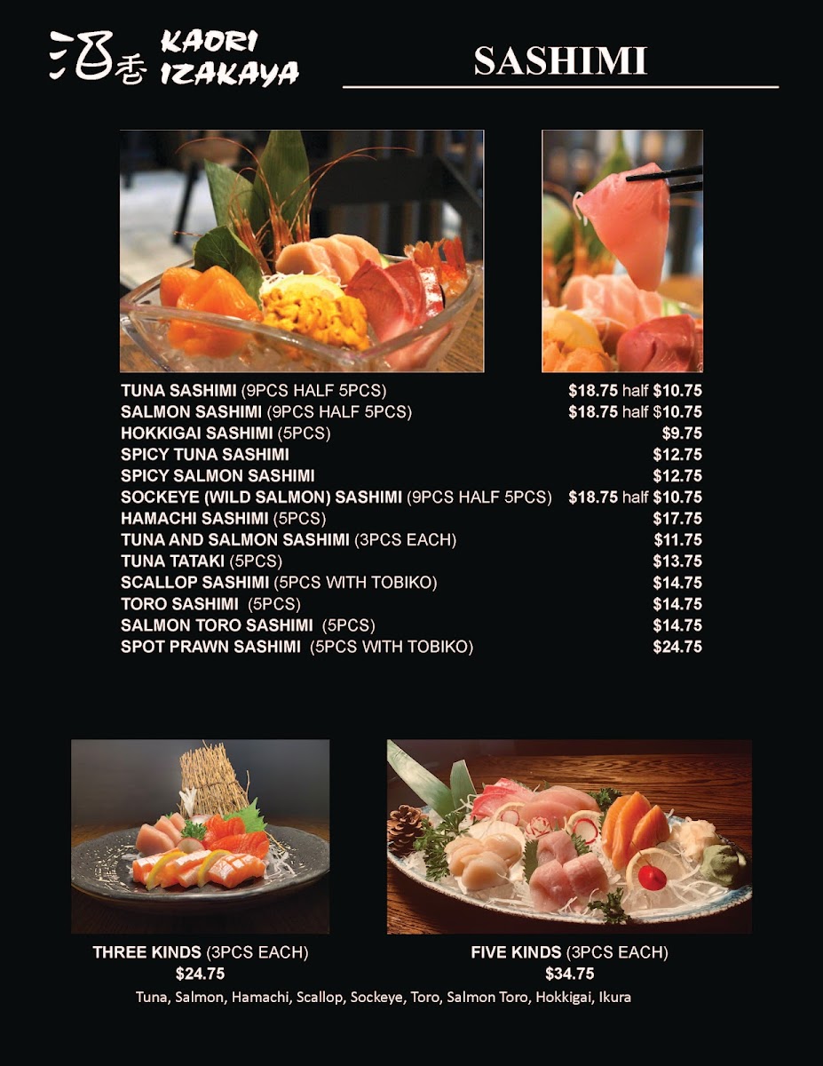 Choose any three Sashimi-Tuna, Salmon, Hamachi, Scallop, Sockeye, Toro, Salmon Toro.