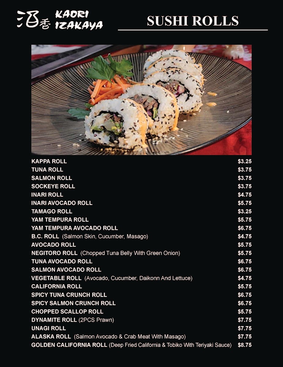 Kappa roll, Yam Tempura roll, 2 Vegetable Rolls, Yam Avocado Roll, Avocado roll and 3 pcs Inari
